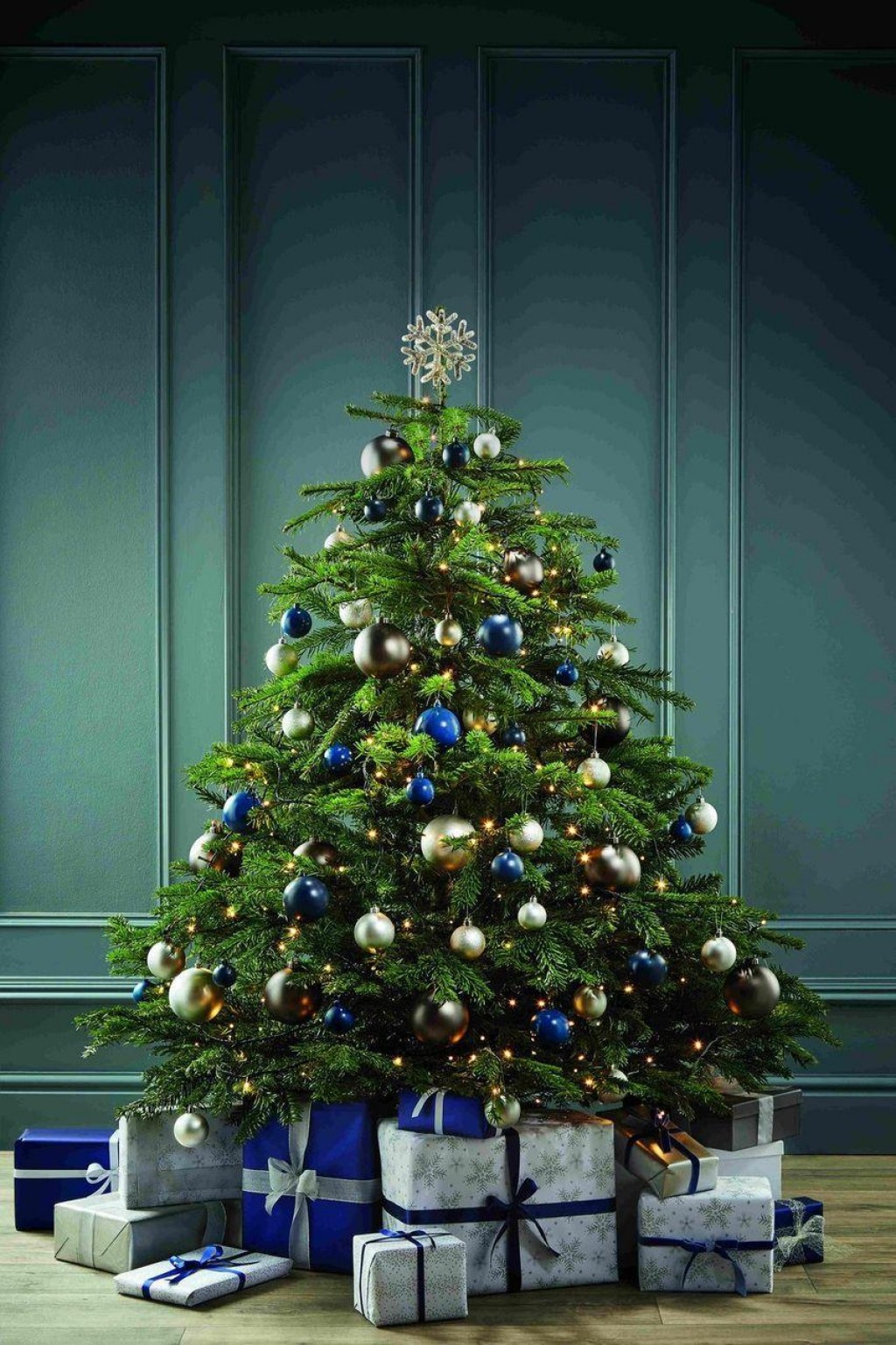 Con adornos en plata y azul